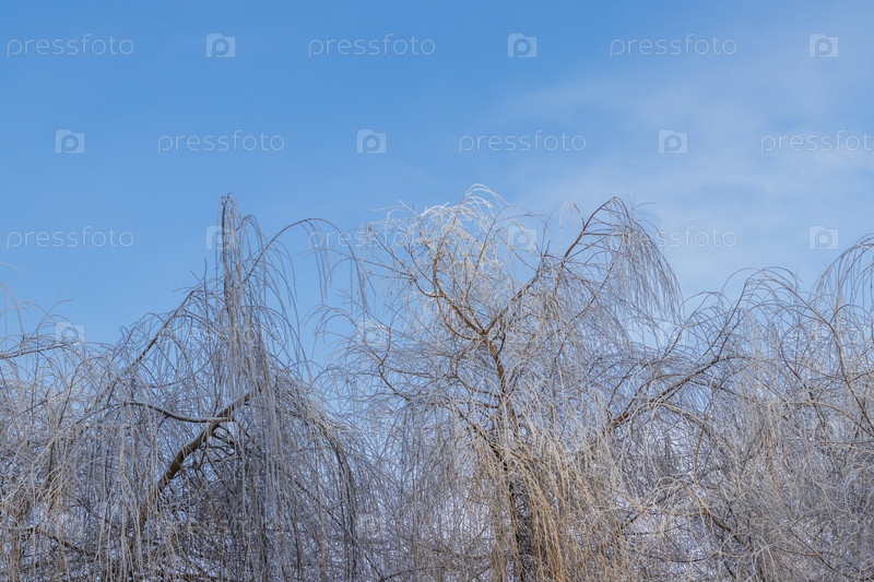 Зимняя сцена с деревьями, покрытыми мокрой мерзлотой под чистым голубым небом