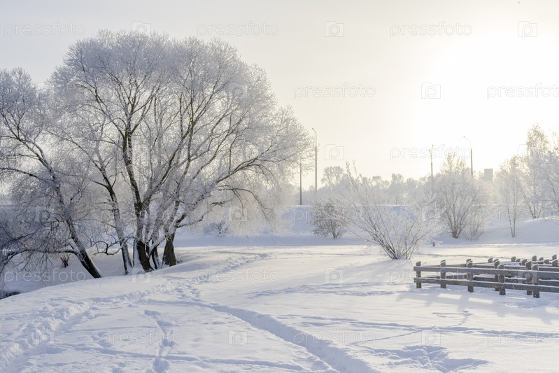 Зимняя сцена с деревьями, покрытыми морозом под чистым голубым небом