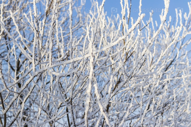 Зимняя сцена с деревьями, покрытыми морозом под чистым голубым небом