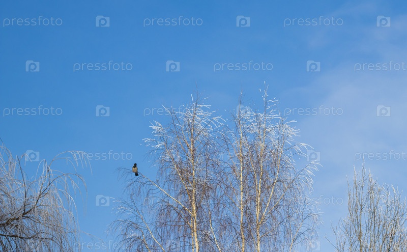 Зимняя сцена с деревьями, покрытыми мокрой мерзлотой под чистым голубым небом. Ворона сидит на бранче. На свежем воздухе