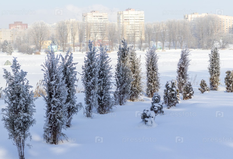 Зимняя сцена с вечнозелеными деревьями, саженцами, покрытыми снегом