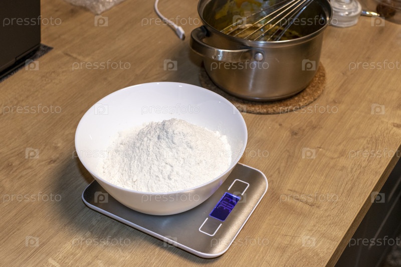 Снимок миски с мукой на портативной электронной весы