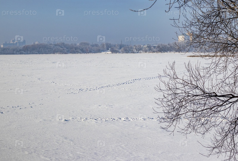 Замороженный водоем, покрытый снегом