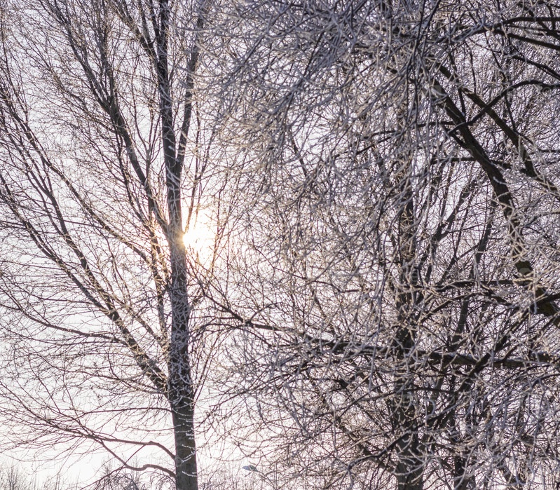 Солнце светит сквозь ветви дерева, покрытого снегом и морозом