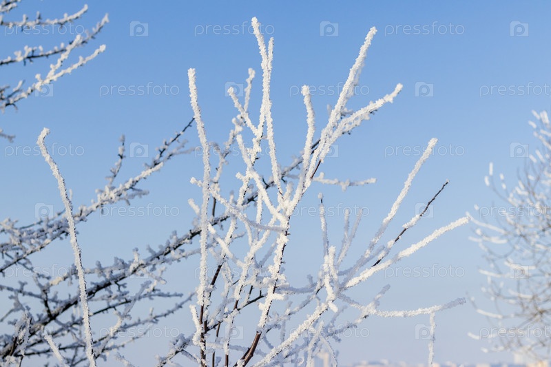 Зимняя сцена с деревьями, покрытыми морозом под чистым голубым небом