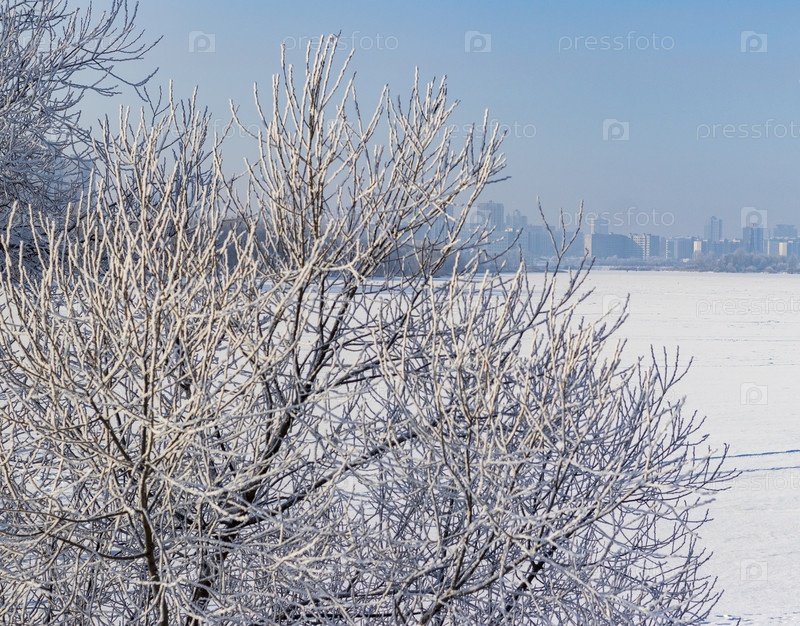 Зимняя сцена с деревьями, покрытыми морозом под чистым голубым небом