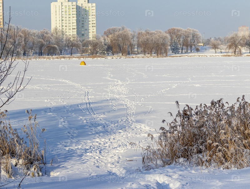 Замороженный водоем, покрытый снегом. Сезон. Зима