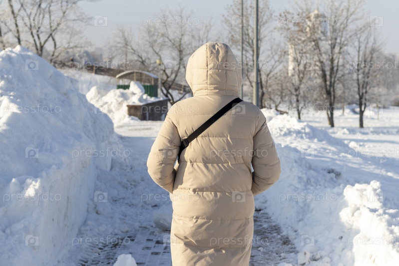 Женщина гуляет на улице зимой, одета в бежевое пальто с капюшоном и повсюду снег