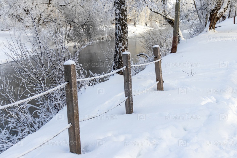 Зимняя сцена с деревьями у реки, покрытыми соломинкой под чистым голубым небом. ландшафт