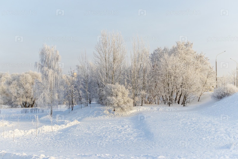 Зимняя сцена с деревьями, покрытыми морозом под чистым голубым небом
