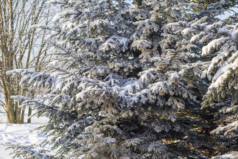 Зимняя сцена с вечнозелеными деревьями, саженцами, покрытыми снегом