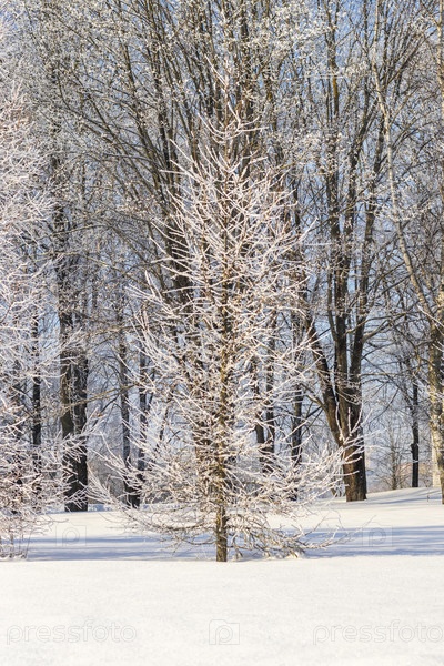 Зимняя сцена с деревьями, покрытыми морозом под чистым голубым небом