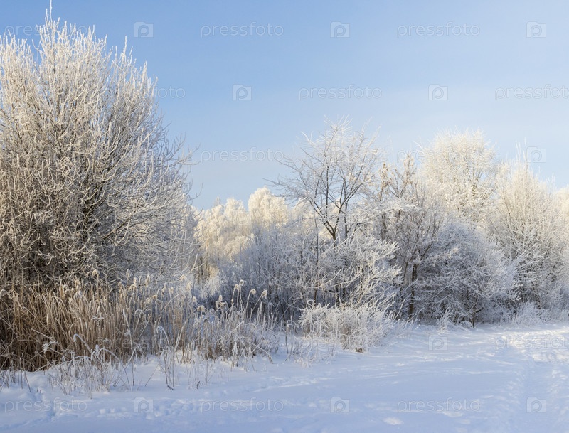 Зимняя сцена с деревьями, покрытыми морозом под чистым голубым небом
