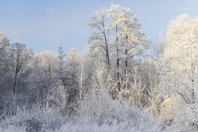 Зимняя сцена с деревьями, покрытыми морозом под чистым голубым небом