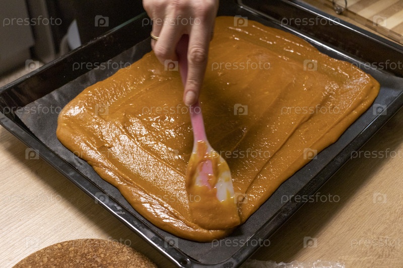 Человек разносит коричневый, тяжелый сладкий сливочный крем на тарелке для выпечки