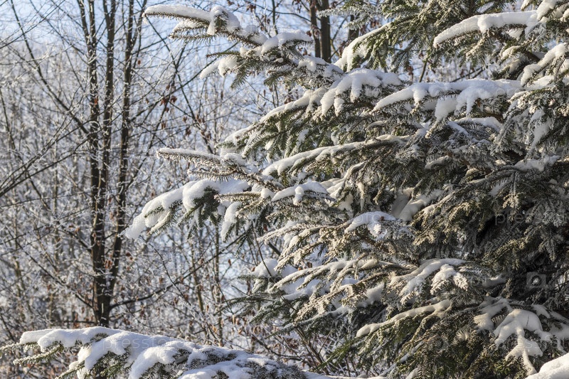Зимняя сцена с вечнозелеными деревьями, саженцами, покрытыми снегом