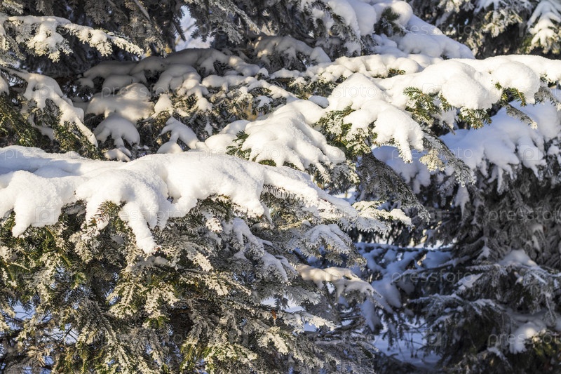 Зимняя сцена с вечнозелеными деревьями, саженцами, покрытыми снегом