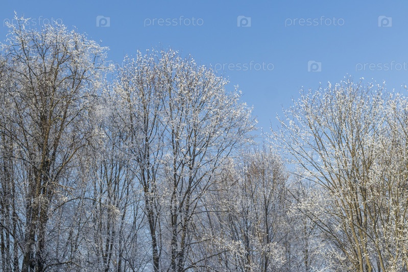 Зимняя сцена с деревьями, покрытыми морозом под чистым голубым небом
