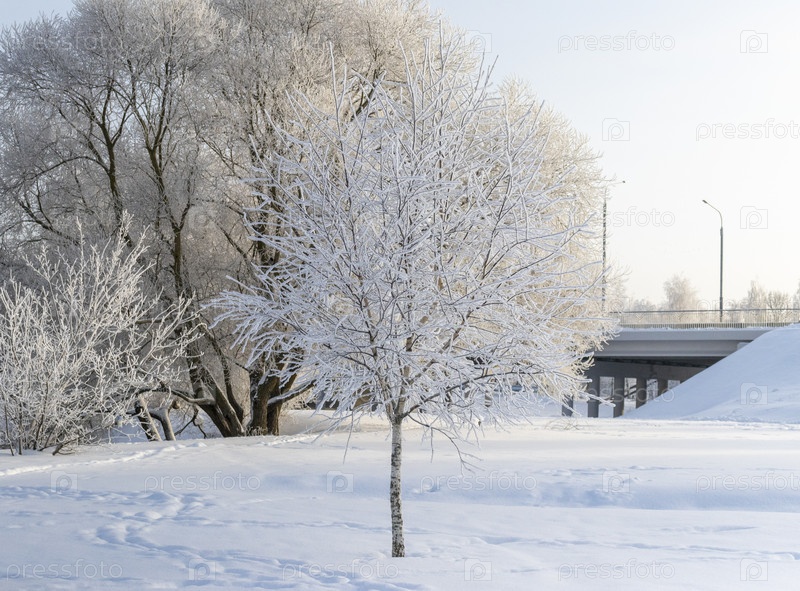 Зимняя сцена с деревьями, покрытыми морозом под чистым голубым небом
