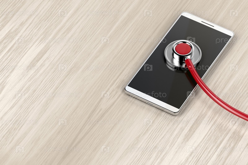 Смартфон и стетоскоп на деревянном столе