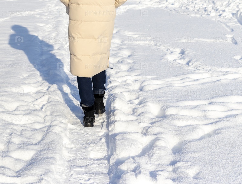 Женщина гуляет на улице зимой, одета в бежевое пальто с капюшоном и повсюду снег