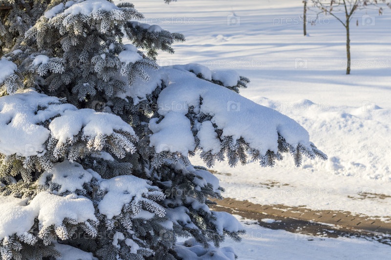 Зимняя сцена с вечнозелеными деревьями, саженцами, покрытыми снегом