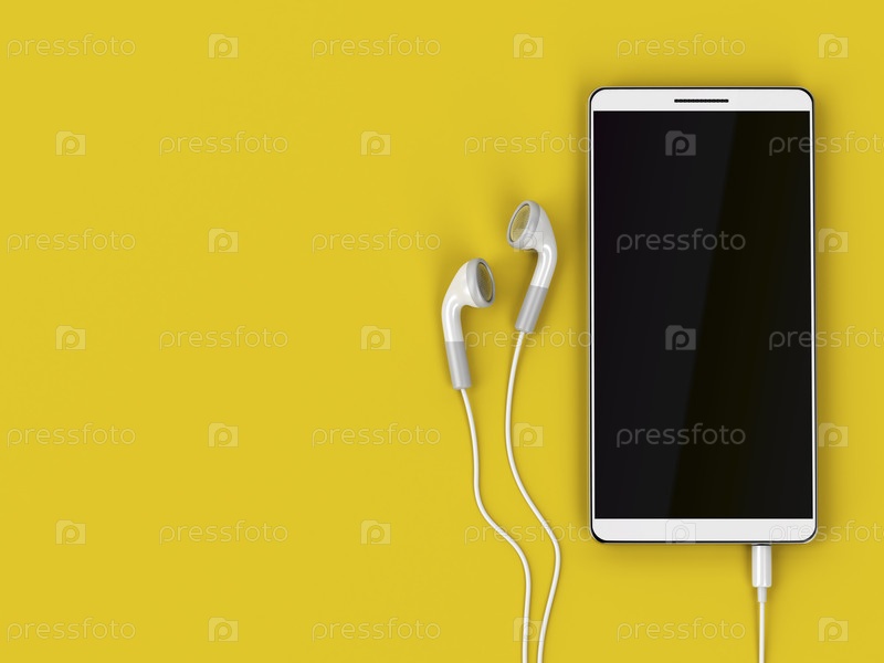 Смартфон и проводные наушники на желтом фоне
