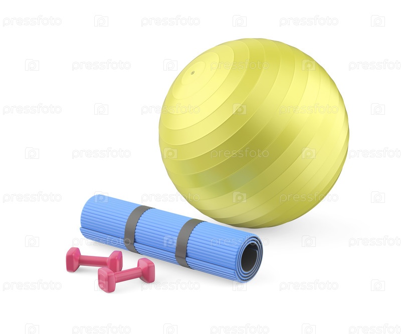 Пара гантеликов, резиновый фитнес-мат и тренировочный мяч