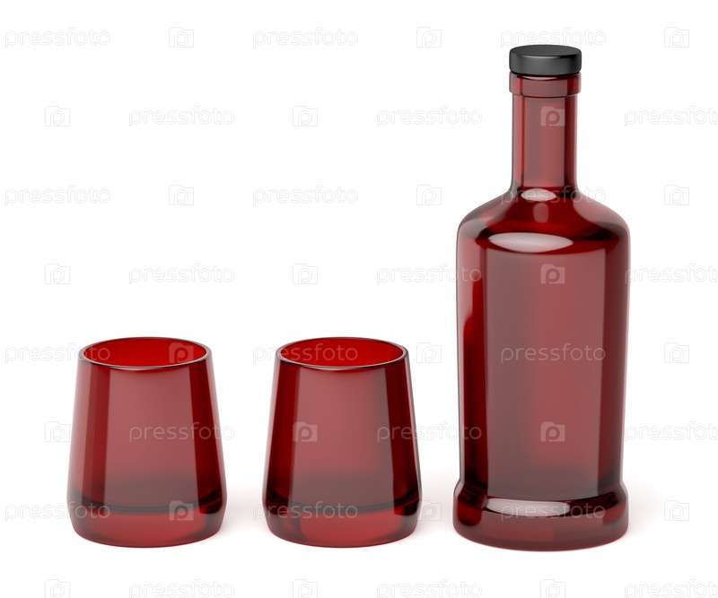 Красная стеклянная бутылка и два бокала