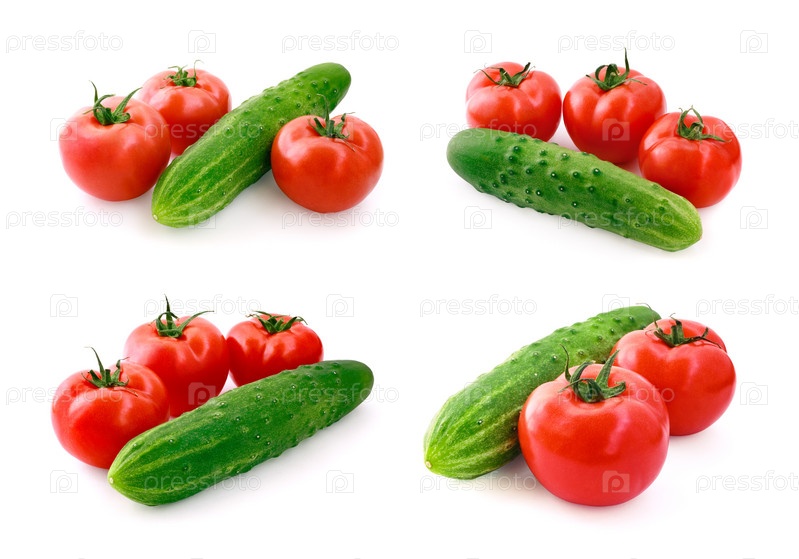 Свежие огурцы и помидоры на белом фоне