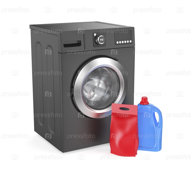 Бутылка жидкого моющего средства и мешок с стиральным порошком перед стиральной машиной