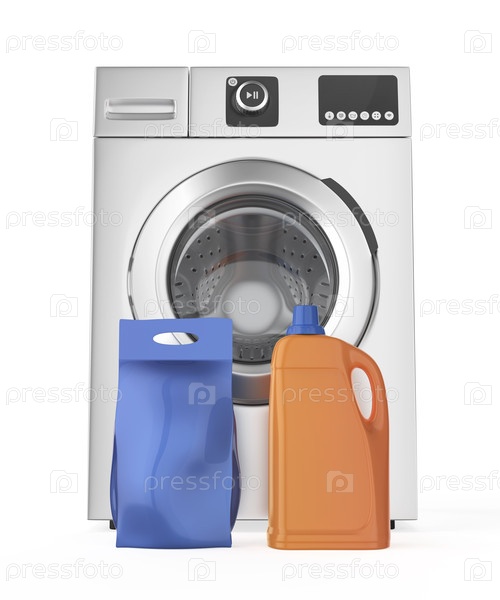 Бутылка жидкого моющего средства и мешок с стиральным порошком перед стиральной машиной