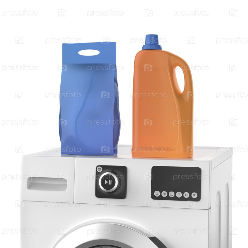 Бутылка с жидким моющим средством и мешок для стирального порошка на стиральной машине