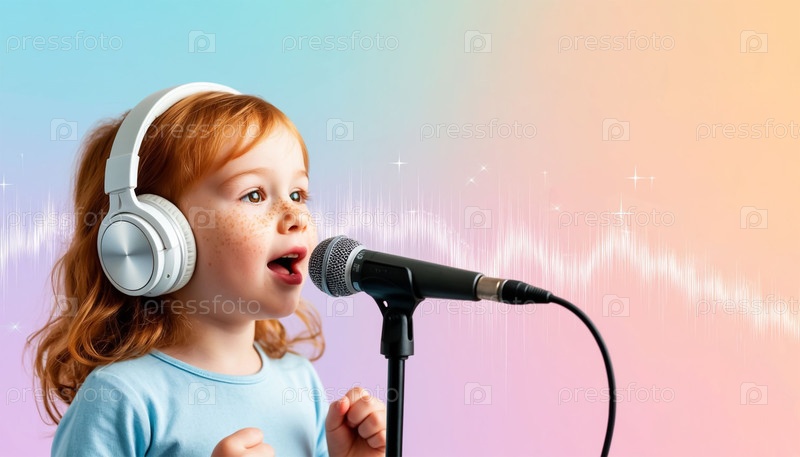 Девочка в наушниках слушает музыку, поющая в микрофон на пастельном фоне с звуковыми волнами