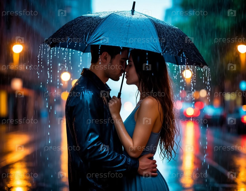 Молодая влюбленная пара, парень и девушка, целуются в городе под зонтиком во время дождя