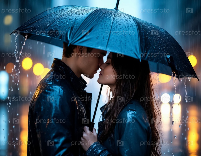Молодая влюбленная пара, парень и девушка, целуются в городе под зонтиком во время дождя