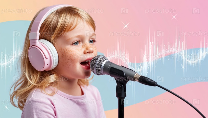 Девочка в наушниках слушает музыку, поющая в микрофон на пастельном фоне с звуковыми волнами