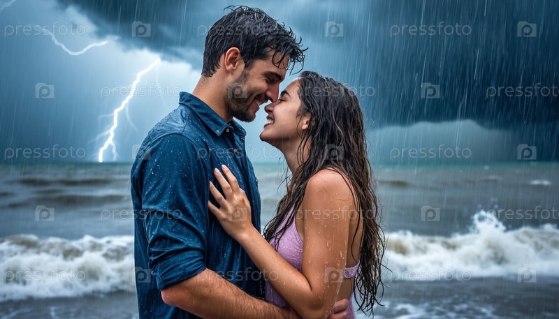 Любящая пара, парень и девушка, латиноамериканцы, страстно целуются на берегу моря во время шторма и грозы