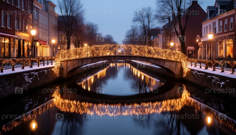 Мост, украшенный рождественскими огнями над рекой