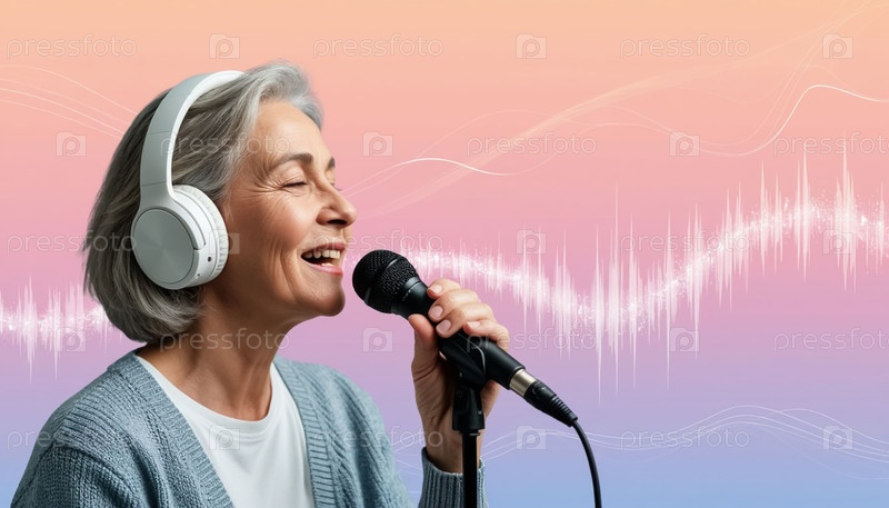 Пожилая женщина с наушниками слушает музыку, которая поет в микрофон на пастельном фоне со звуковыми волнами