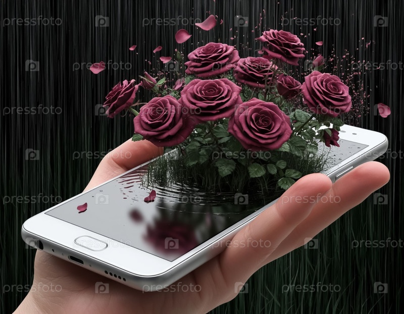 Цифровая 3D-проекция: бургундский розовый куст поднимается над дисплеем смартфона, идет дождь