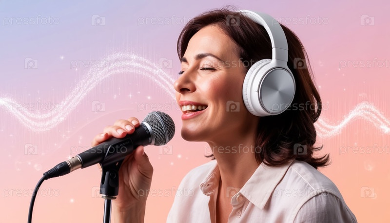 Женщина в наушниках слушает музыку, поющая в микрофон на пастельном фоне с звуковыми волнами