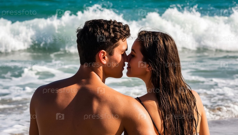 Влюбленная пара целуется с парнем и девушкой на берегу моря на фоне волн. Близкий план, природа, любовные отношения