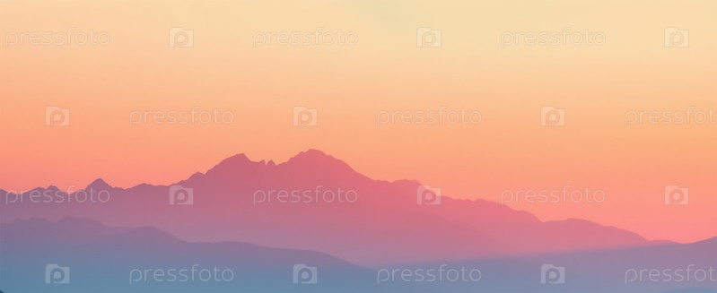 Минималистический пейзаж туманных гор на восходе солнца в пастельных цветах
