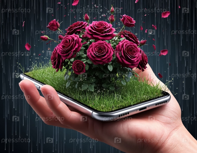Цифровая 3D-проекция: бургундский розовый куст поднимается над дисплеем смартфона, идет дождь