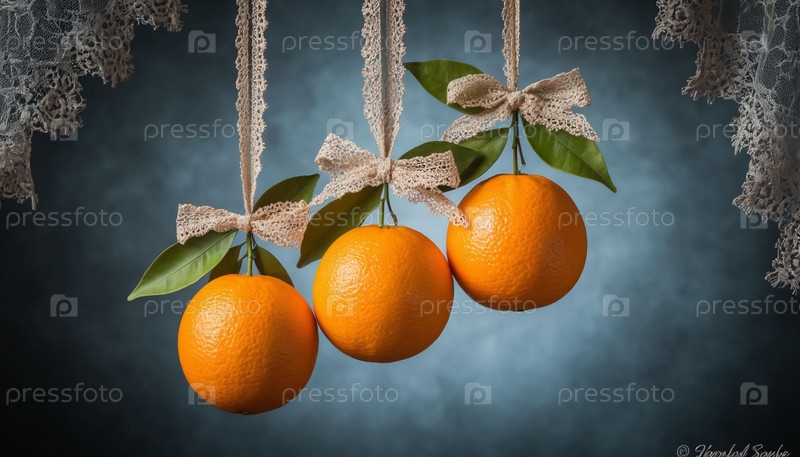 Апельсины украшены кружевками и кружками на Рождество, а фон - копировальным пространством