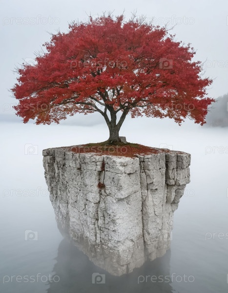 Минималистский осенний ландшафт: краснолистое дерево на белой скале с туманом и отражением воды. Спокойная, но драматическая фотография природы со зеркальной симметрией