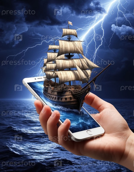 Цифровая 3D-проекция: корабль появляется на дисплее смартфона, который держится в руке