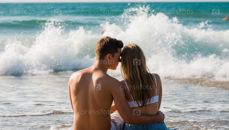 Влюбленная пара целуется с парнем и девушкой на берегу моря на фоне волн. Близкий план, природа, любовные отношения