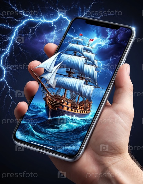 Цифровая 3D-проекция: корабль появляется на дисплее смартфона, который держится в руке